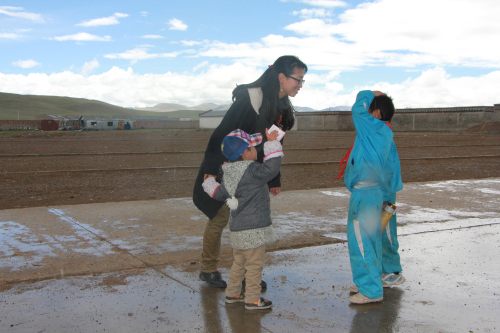 2007年8月援教期滿后,白覺措回到拉薩,在當(dāng)雄縣納木湖鄉(xiāng)中心小學(xué)任教。四千八百米的納木湖鄉(xiāng)中心小學(xué)是拉薩市海拔最高的學(xué)校。每到冬天,這里都會(huì)迎來(lái)大風(fēng)雪。而在大雪封山時(shí),蔬菜是運(yùn)不進(jìn)來(lái)的。所以,白覺措和其他老師還要利用休息的時(shí)間帶領(lǐng)學(xué)生們?cè)趯W(xué)校的高寒溫棚內(nèi)自己種菜,以備不時(shí)之需。白覺措淡淡得說(shuō)道:“這里的夏天是很美,冬天卻讓人受不了。而且夏天并不是天天都是風(fēng)和日麗,時(shí)不時(shí)還會(huì)來(lái)場(chǎng)冰暴。”正說(shuō)話間,豆大的冰雹就下起來(lái),“噼哩叭啦”打在窗戶上。白覺措急忙起身向外走去,因?yàn)檎滴顼垥r(shí)間,學(xué)生們正朝食堂走向。天冷地滑,怕學(xué)生摔倒白覺措拉著自己兩歲半的兒子,站在空地上,對(duì)著遠(yuǎn)處跑來(lái)的學(xué)生不停地喊道:“慢點(diǎn),慢點(diǎn),小心摔倒!……”。