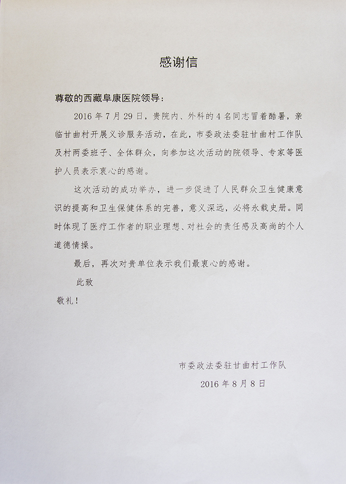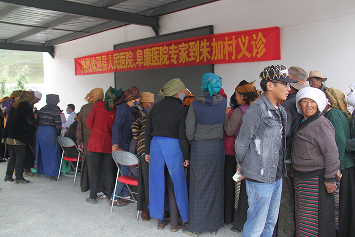 2016年7月,林周縣朱加村村委會、甘曲村村委會受當(dāng)?shù)卮迕袼校c林周縣人民醫(yī)院和西藏阜康醫(yī)院相關(guān)負責(zé)人取得聯(lián)系,希望能夠派遣醫(yī)療義診隊為當(dāng)?shù)卮迕衩赓M義診。7月29日經(jīng)相關(guān)領(lǐng)導(dǎo)協(xié)調(diào),西藏阜康醫(yī)院派出了由外科專家李玉仲、內(nèi)科專家劉占懷及幾名護理人員組成的義診小分隊先后前往朱加村、甘曲村為當(dāng)?shù)卮迕衩赓M義診。