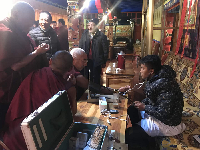 由于當(dāng)天寺廟在進行法會活動,有部分僧侶沒有到場。義診隊共計為200多名僧侶進行了體檢,期間得到了羅布次仁處長、索次主任的大力支持與幫助。在離開寺廟時,羅布次仁處長握著田豐輝醫(yī)生的手深切地說:“你們辛苦了!”其言雖短,但至真至切。