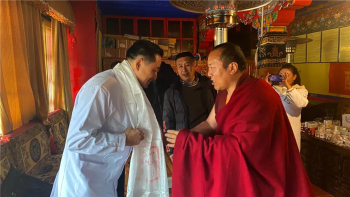 義診結(jié)束后,甘丹寺經(jīng)師阿旺曲帕為義診組每位成員獻(xiàn)上哈達(dá),以表達(dá)對(duì)阜康醫(yī)院的感激之情。