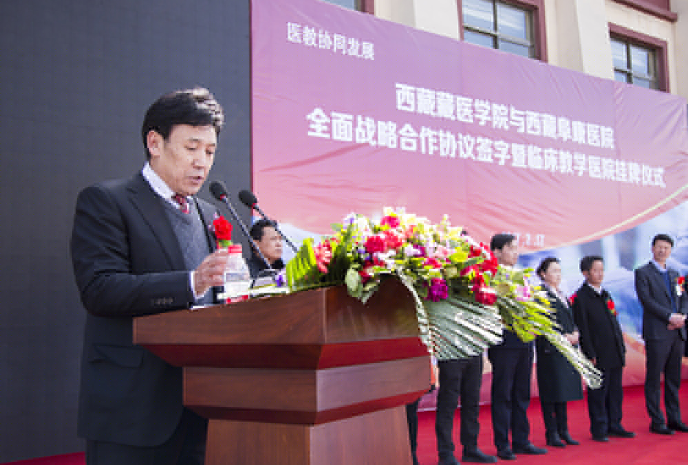 隨后,王斌董事長在儀式中發(fā)表講話,全面介紹了西藏藏醫(yī)學院及西藏阜康醫(yī)院的發(fā)展歷程,并表示西藏藏醫(yī)學院和西藏阜康醫(yī)院達成全面戰(zhàn)略合作,旨在進一步加強雙方戰(zhàn)略合作關系,雙方將在良好的合作和互信基礎上,本著“優(yōu)勢互補、資源共享、互惠互利、合作共贏”的原則,重點在人才培養(yǎng)、科學研究、學科建設、醫(yī)療服務等方面開展長期合作,提升雙方在醫(yī)療、科研、人才培養(yǎng)及社會服務等方面的綜合水平;王斌董事長還表示,為培養(yǎng)應用型醫(yī)學人才,西藏阜康醫(yī)院特在西藏藏醫(yī)學院設立了30萬元助學、助教基金,用于幫助學習優(yōu)秀卻又家境貧寒的莘莘學子和鼓勵辛勤耕耘的優(yōu)秀教師。