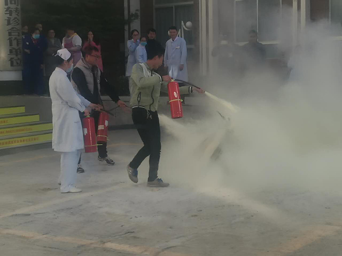 第二部分在我院住院區(qū)大院內(nèi),消防隊員進(jìn)行了現(xiàn)場演示,講解了如何使用滅火器,并現(xiàn)場點燃了一堆火,使用滅火器將大火撲滅,以直觀的方式,告訴醫(yī)護(hù)人員如何使用滅火器材;我院員工也派出后勤、臨床代表參加了演練。