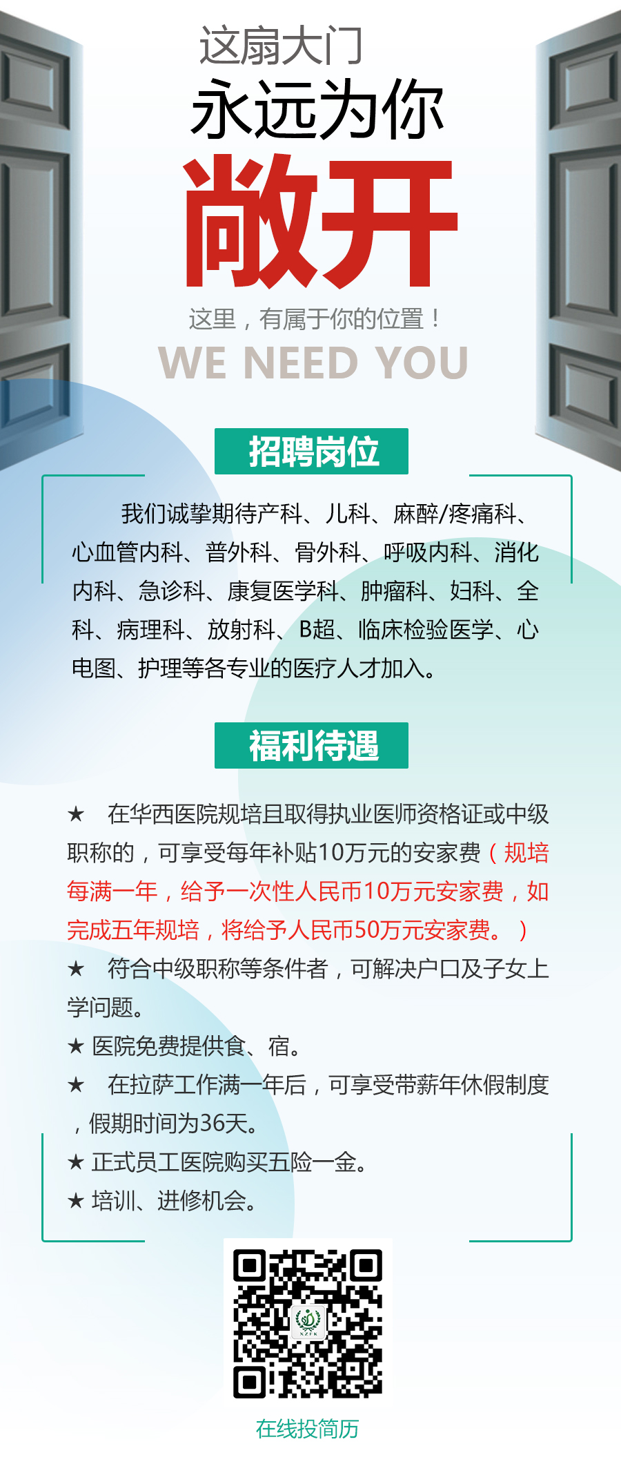 西藏阜康醫(yī)院面向社會公開招聘產(chǎn)科、兒科、麻醉/疼痛科、心血管內(nèi)科、普外科、骨科、呼吸內(nèi)科、消化內(nèi)科、急診科、康復(fù)醫(yī)學(xué)科、婦科、全科、病理科、放射科、B超、臨床檢驗、心電圖等各專業(yè)的醫(yī)療人才。對于在華西醫(yī)院完成住院醫(yī)師規(guī)范化培訓(xùn)且取得執(zhí)業(yè)醫(yī)師資格證或中級職稱的醫(yī)師,一經(jīng)錄用,按參加規(guī)培年限每年10萬給付安家費(完成3年規(guī)培,給予30萬安家費;完成5年規(guī)培,提供安家費的規(guī)培醫(yī)師必須簽訂合同在阜康服務(wù)六年,否則按差額服務(wù)年限退回相應(yīng)的安家費),工資獎金另算。望廣大醫(yī)療人才踴躍投遞簡歷,為祖國西部醫(yī)療事業(yè)貢獻(xiàn)力量。