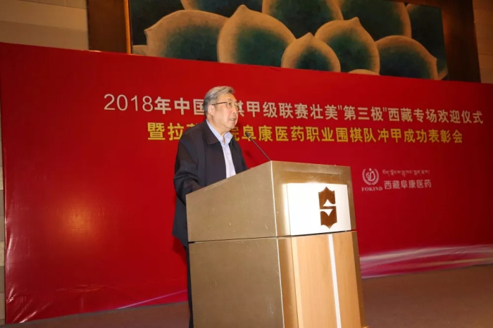 中國圍棋協(xié)會主席林建超將軍在致辭中表示,拉薩棋院西藏阜康醫(yī)藥職業(yè)圍棋隊沖甲成功是全國圍棋運動中的一件大事。它首先改變了當(dāng)代中國圍棋運動的版圖,雪域高原第一次在中國圍棋甲級聯(lián)賽中占有了一席之地;其次,這次沖甲實現(xiàn)了西藏體育發(fā)展的一次突破,使西藏在全國性的體育賽事中,擁有了第一支甲級職業(yè)隊伍;第三,本次沖甲成功,為圍棋文化和藏式棋類文化的交融促進(jìn)提供了一個很好的契機,為西藏地區(qū)棋文化的發(fā)展起到了很好的推動作用。這項成績來之不易,首先應(yīng)該歸功于自治區(qū)各級黨委、政府的重視,尤其是齊扎拉主席長期以來對包括圍棋、藏式棋等棋類活動的支持,有效促進(jìn)了這項中華民族優(yōu)秀傳統(tǒng)文化在雪域高原的普及與發(fā)展,這是與習(xí)近平總書記在十九大報告中提出的戰(zhàn)略目標(biāo)相一致的。