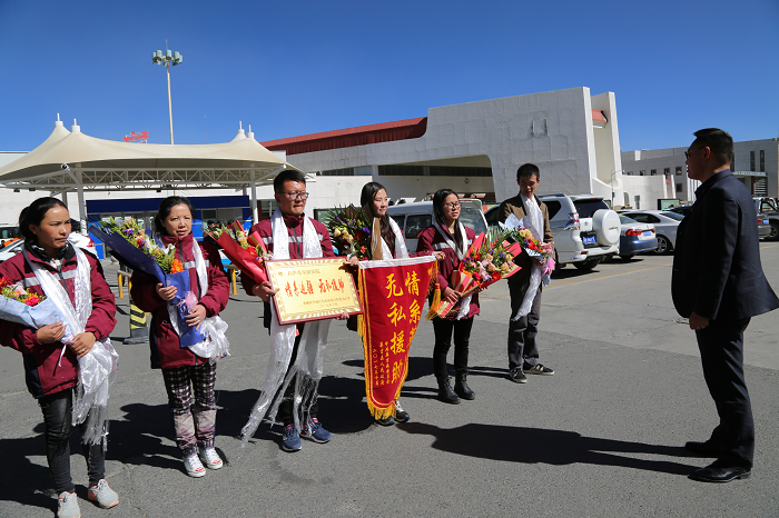 ? 值此秋高氣爽、碩果累累的豐收季節(jié),10月23日,阜康醫(yī)療隊(duì)圓滿(mǎn)完成阿里地區(qū)包蟲(chóng)病義務(wù)篩查任務(wù),滿(mǎn)載榮譽(yù)而歸,隨著醫(yī)療隊(duì)全體成員從拉薩機(jī)場(chǎng)緩緩走出,陳彬副書(shū)記代表公司黨委對(duì)他們表示了熱烈的歡迎,并為每位隊(duì)員獻(xiàn)上鮮花和哈達(dá),歡迎他們回家。