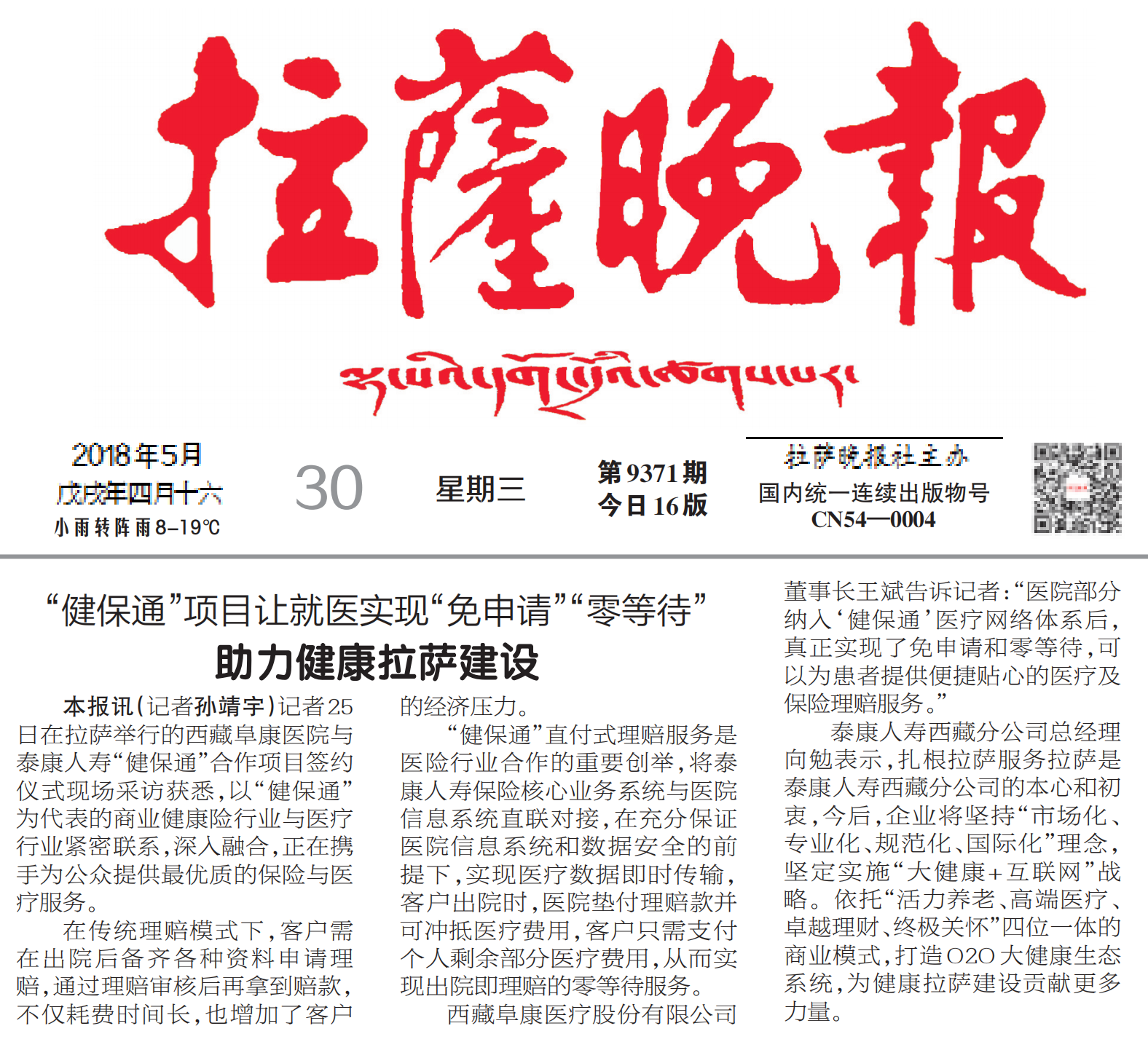 西藏阜康醫(yī)療股份有限公司董事長(zhǎng)王斌告訴記者:“醫(yī)院部分納入‘健保通’醫(yī)療網(wǎng)絡(luò)體系后,真正實(shí)現(xiàn)了免申請(qǐng)和零等待,可以為患者提供便捷貼心的醫(yī)療及保險(xiǎn)理賠服務(wù)。”