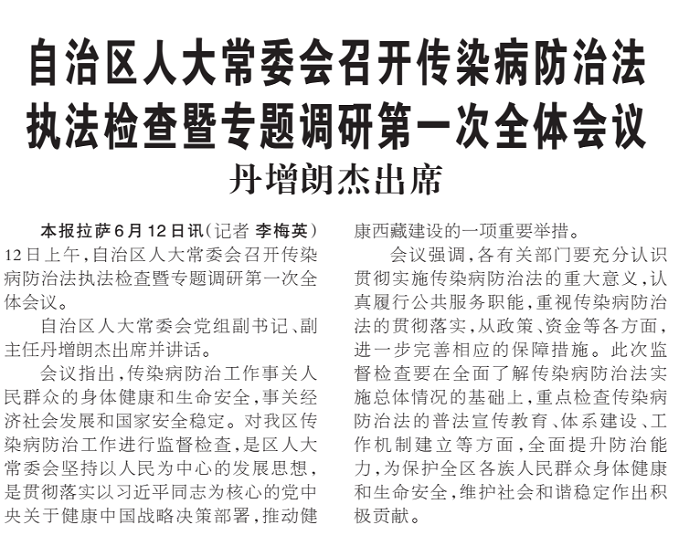 - · 自治區(qū)人大常委會(huì)召開(kāi)傳染病防治法 執(zhí)法檢查暨專(zhuān)題調(diào)研第一次全體會(huì)議——丹增朗杰出席