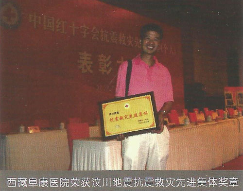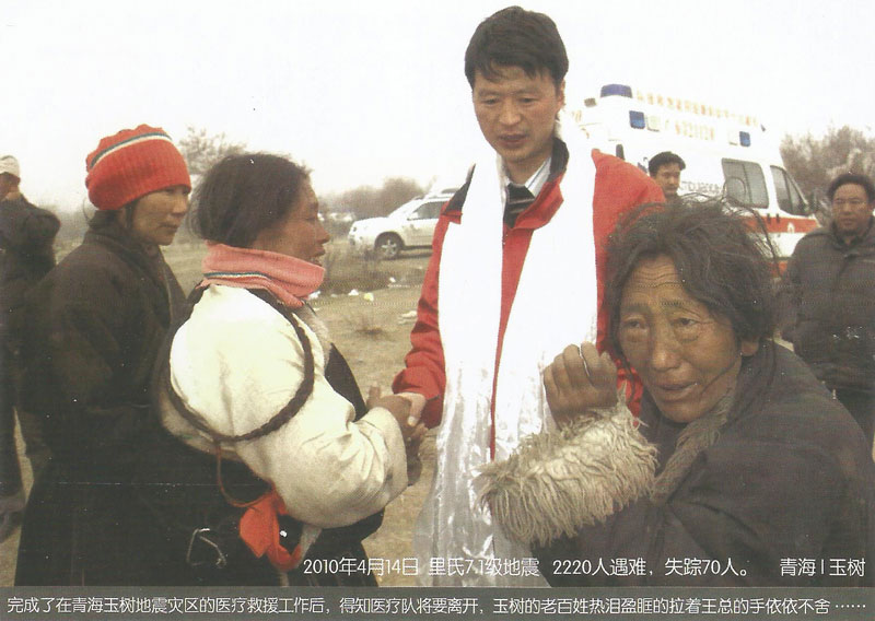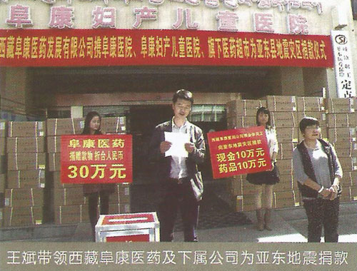 2008年5月12日14時28分,在得知發(fā)生在四川汶川8級的強(qiáng)烈地震后,王斌被深深的震撼了,5月13日第一時間帶頭捐款并號召全公司347名員工為災(zāi)區(qū)人民獻(xiàn)愛心,在王斌的帶領(lǐng)下短短的一上午公司即向西藏紅十字會捐款10062萬元(其中王斌個人捐款5062萬元)。13日下午,王斌隨即召開阜康醫(yī)院醫(yī)務(wù)人員趕赴災(zāi)區(qū)醫(yī)療救援動員大會,并迅速組建了一支由他本人作為領(lǐng)隊(duì)的26人醫(yī)療救援隊(duì)。同時他還帶領(lǐng)醫(yī)療隊(duì)為盡快抵達(dá)地震災(zāi)區(qū)并第一時間參與醫(yī)療救援,而且決定在成都臨時購買一輛配備完善的救護(hù)車,還包括大量藥品、生活物品、以及部分醫(yī)療設(shè)備,此次救災(zāi)共投入130余萬元。