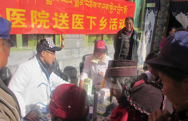 當(dāng)?shù)氐鸟v村干部,生格鄉(xiāng)政府、生格鄉(xiāng)衛(wèi)生院的領(lǐng)導(dǎo)接待了我們,得知我們趕路沒(méi)來(lái)得及吃早餐,特意煮了粥,炒了雞蛋和僅有的幾顆青菜。在他們的組織下,木村的百姓在村委會(huì)的院子里排起了長(zhǎng)長(zhǎng)的候診隊(duì)伍。院子里擺好了桌子、凳子,算是簡(jiǎn)易的診斷臺(tái),我負(fù)責(zé)測(cè)血壓、了解病情,護(hù)士小楊負(fù)責(zé)發(fā)藥,心電圖和B超由小張負(fù)責(zé)做,當(dāng)?shù)匦l(wèi)生院的吳金院長(zhǎng),以及醫(yī)生達(dá)次給我們當(dāng)翻譯。
