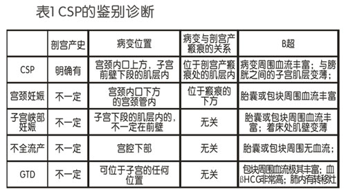 CSP患者全部都有明確的剖宮產(chǎn)史,胎囊著床在剖宮產(chǎn)瘢痕內(nèi),周圍有豐富的血流,瘢痕處肌壁變薄。在臨床工作中,CSP易與宮頸妊娠、子宮峽部妊娠、不全流產(chǎn)和滋養(yǎng)細(xì)胞疾病相混淆,需要仔細(xì)鑒別。一般通過病史、妊娠囊位置和B超檢查鑒別必要時(shí)可行血清βHCG、肺CT和病理檢查。