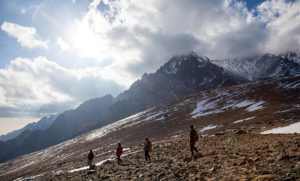 走到一個高崖的時候,C終于支撐不住停了下來,說是發(fā)燒了,我摸摸他的額頭,果然有些滾燙炙手,當下慌亂起來,不知該作何措施,只得用頭巾稍微把他的頭發(fā)盡量擦干些,大哥也給他服下了什么含片,才見到一絲好轉。還好,我這個人越在艱苦惡劣的環(huán)境,身體越是堅不可摧,這至少不會給他心里再帶去什么負擔。大概十分鐘后,我們又接著出發(fā)了,而且沒多久便見到了今天要過的第一座橋。